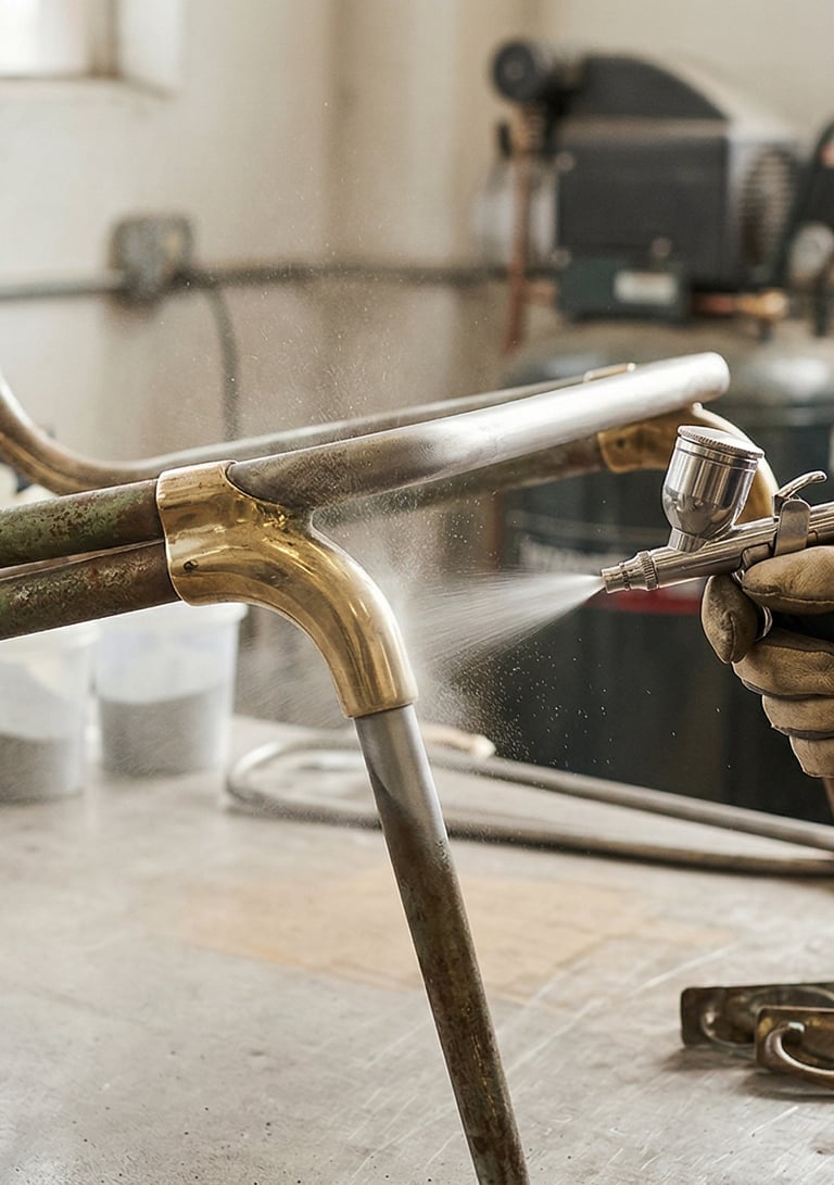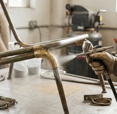 La Cabine de Traitement de Surfaces : C’est le cœur technique de l’atelier. Équipée de systèmes de gommage, de sablage et de microbillage, dans cette zone je réalise une remise à nu totale et homogène, indispensable avant toute finition de qualité. Le contrôle de la pression et de la granulométrie des abrasifs y est absolu.